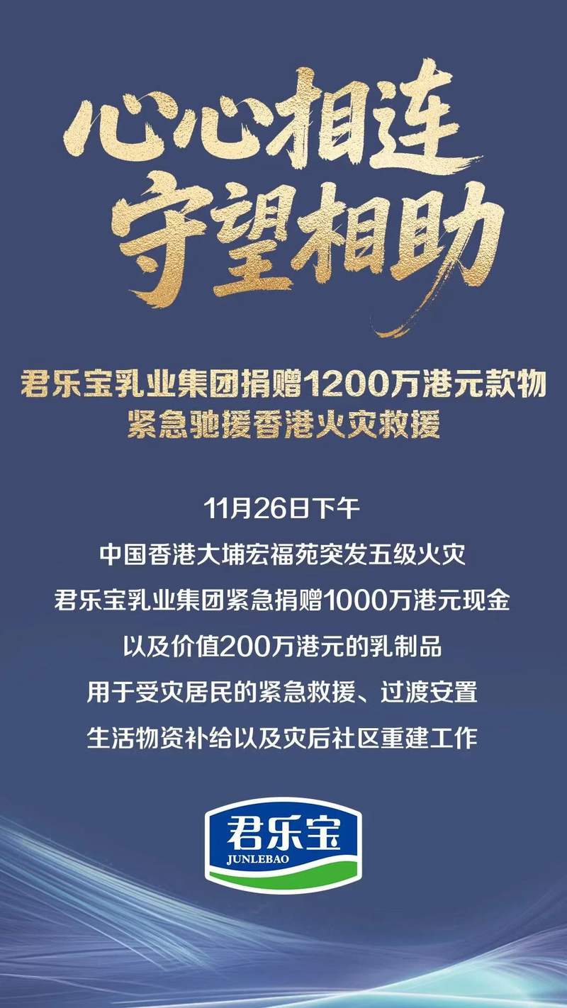 新京报讯(首席记者郭铁)中国香港大埔宏福苑近日突发五级火灾,牵动人心。君乐宝乳业集团已紧急捐赠1000万港元现金,并追加价值200万港元的乳制品,用于受灾居民的紧急救援、过渡安置、生活物资补给以及灾后社区重建工作。