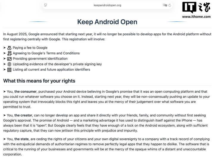 对此,多家开源社区强烈反对,认为谷歌政策违背市场竞争与数字主权,对第三方开发者及应用商店不利,这些社区成员以“KeepAndroidOpen”为号召,发起联名公开信。