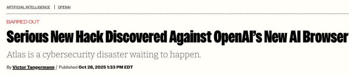 而AI作为一种软件,也存在安全问题,比如,AI浏览器普遍面临「提示词注入」攻击,ChatGPT Atlas已「惨遭毒手」: