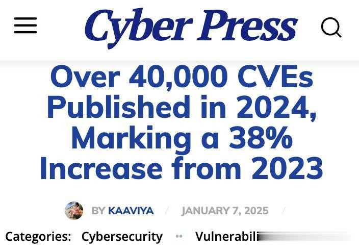 仅2024年,公共漏洞和暴露(CVE, Common Vulnerabilities and Exposures)数量就超过4万例, 年增长率高达38%。
